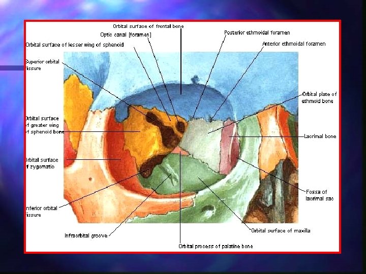 Orbita osoasă piramidă patrulateră ü baza – ADITUS palpabilă ü vârful – fisura orbitară sup. ü perete sup. – frontal + sfenoid – fosa gl. lacrimale ü perete inf. maxila zigomatic şanţ + palatin canal suborbitar Imp. clinică - durere orbitară - colecţie propagată retrobulbar p. lateral: zigomatic sfenoid frontal p. medial: maxile lacrimal etmoid fosa sacului lacrimal sfenoid