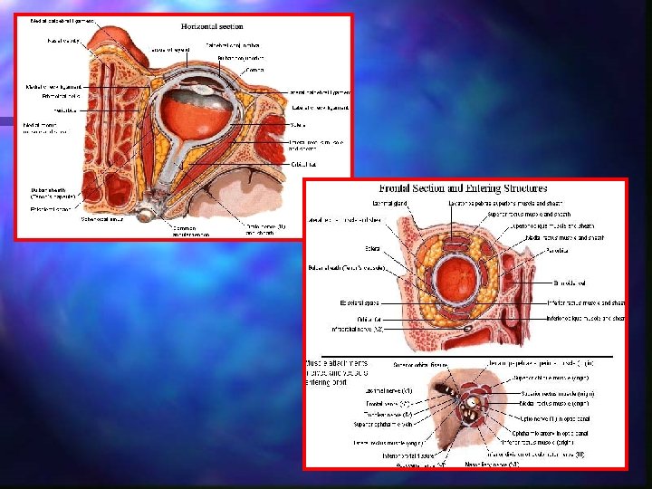 Conţinut v periost § – periorbite Teaca bulbului fibroelastică (segment) de sferă goală § fuzionat cu sclera § inelul conjunctival § spaţiul episcleral – sistem lacrimar LIMFĂ § perforate de – tendoanele mm. extrinseci glob oc. - vase - nervi v permite - enuclearea globului ocular - aplicarea unor proteze §