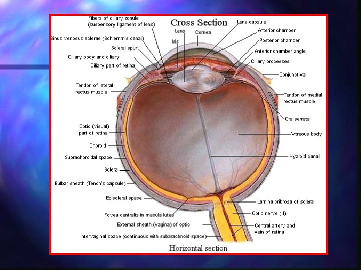 Spaţiul precapsular glob + conjunctiva bulbară (palpebrală) § Bulbul ocular învelişuri + medii transparente şi refrigerente Tunica fibroasă - sclera 5/6 post. - corneea – transp. Tunica vasculară - coroida → discul n. optic ora serrata - corp ciliar → iris - iris – pupila – muşchi §