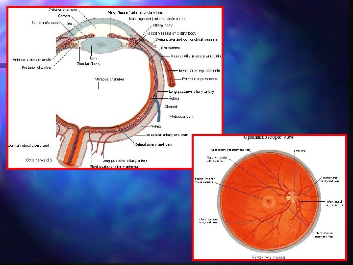 Tunica internă - retina celule receptoare neuron I şi II calea optică porţiuni - retina OPTICĂ - retina CILIARĂ - retina IRIDIANĂ ora serrata discul nervului optic excavaţia discului macula lutea foseta centrală OARBĂ