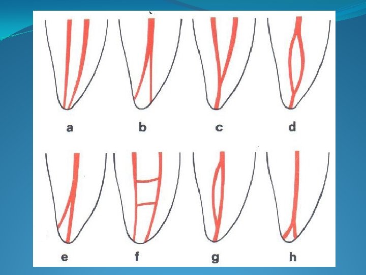 3. 3 ): Classification de Carames et de Aprile v. Ramifications longitudinales (a, b, c, d) : - canaux parallèles au principal (a) ; - canaux bifurqués (b) ; - canaux fusionnés (c) ; - canaux bifurqués et fusionnés (d). v Ramifications collatérales (e, f, g) : - canaux obliques (e) ; - canaux intercanalaires (f) ; - canaux récurrents (g). v Ramifications apicales : delta (h).