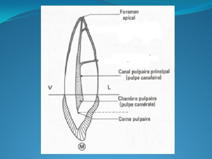 4. 5): la canine supérieure: q coupe verticale: ü La cavité pulpaire suit l'anatomie générale de la dent. ü La corne pulpaire se projette en direction de la pointe canine. ü Il n'existe pas de limite nette entre chambre pulpaire et canal radiculaire.