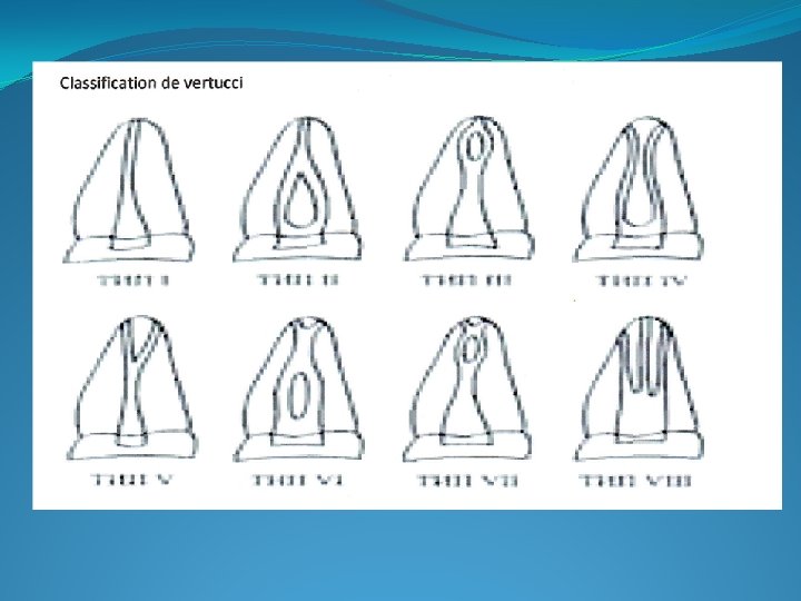3. 2): Classification de Vertucci: La classification de Vertucci est plus élaborée et prévoit 8 types : • Type I : un seul canal avec un seul orifice et un seul foramen apical. • Type II : deux canaux se rejoignant en un seul canal et présentant une seule sortie foraminale. • Type III : canal unique se divisant en deux dans la partie moyenne ; les deux canaux se rejoignent dans le tiers apical pour. • Type IV : deux canaux restant distincts jusqu’au tiers apical. • Type V : un canal se divisant en deux canaux dans le tiers moyen ou apical. • Type VI : deux canaux se rejoignant dans le tiers moyen, puis se redivisant dans le tiers apical. • Type VII : un seul canal se divisant, puis se rejoignant et se divisant à nouveau. • Type VIII : trois canaux restant distincts jusqu’au tiers apical.