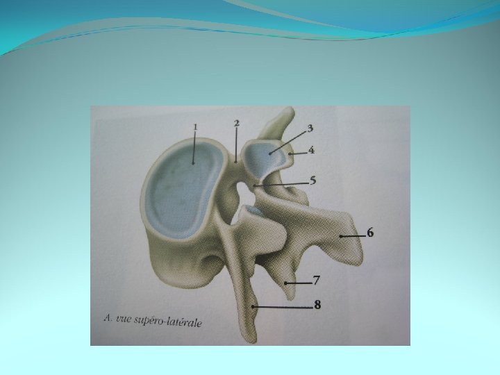 LE RACHIS La morphologie des vertèbres est un peu différente à chaque niveau. La taille du corps vertébral augmente progressivement de la première cervicale à la dernière vertèbre lombaire Les apophyses articulaires sont verticales au niveau lombaire et plus oblique au niveau cervical ce qui explique une plus grande amplitude des mouvements de rotation cervicale. Chaque vertèbre est formée d’un corps et d’un arc postérieur qui s’implante sur le corps par deux pédicules.