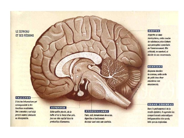 Les noyaux gris centraux • Ilots de substance grise au centre du cerveau • Fonctions diverses – les mouvements involontaires (substance noire) – Intégration des stimulations, association des différentes fonctions (thalamus) – Régulation de la température corporelle, des différentes fonctions végétatives, des sécrétions hormonales (hypothalamus) – Mémorisation (amygdales)