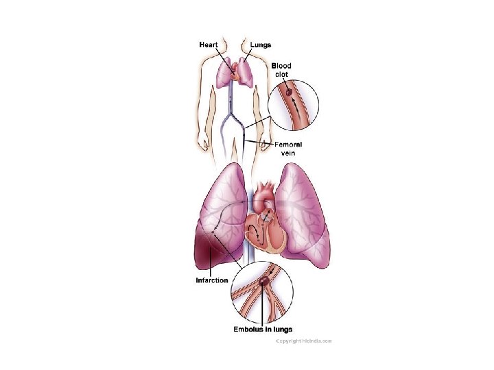 Importance de l’adéquation ventilation/perfusion : l’embolie pulmonaire • Un caillot de sang se forme dans une veine des membres inférieurs puis se détache • Il progresse jusqu’au cœur, puis vas se bloquer dans une branche de l’artère pulmonaire – Donc la zone reste ventilée mais n’est plus perfusée • Cela entraîne une diminution de la Pa. O 2 et de la Sp. O 2 qui n’est que mal corrigée par l’oxygène