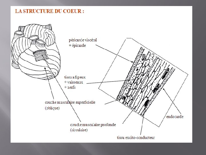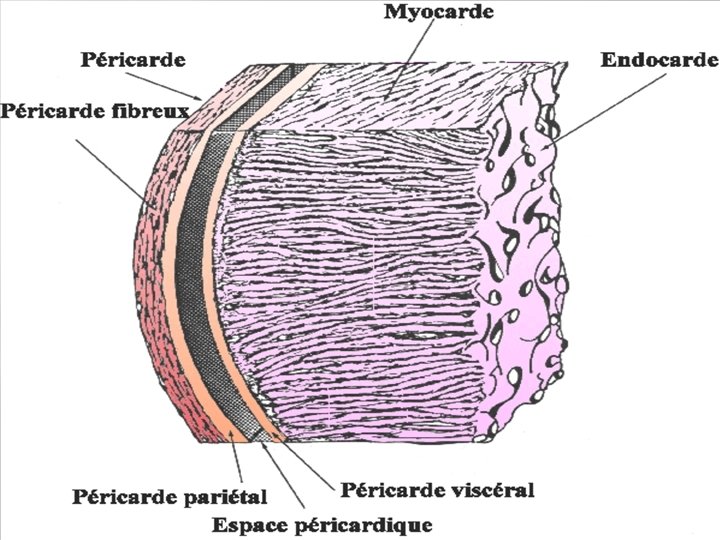 Structure des parois : -endocarde -myocarde -épicarde -le cœur est composé de 2 tissus : -tissu myocardique : activité contractile -tissu nodal : activité électrique nœud sinusal ( OD ) nœud auriculoventriculaire faisceau de HIS : bronche D et G réseau de purkinjé �