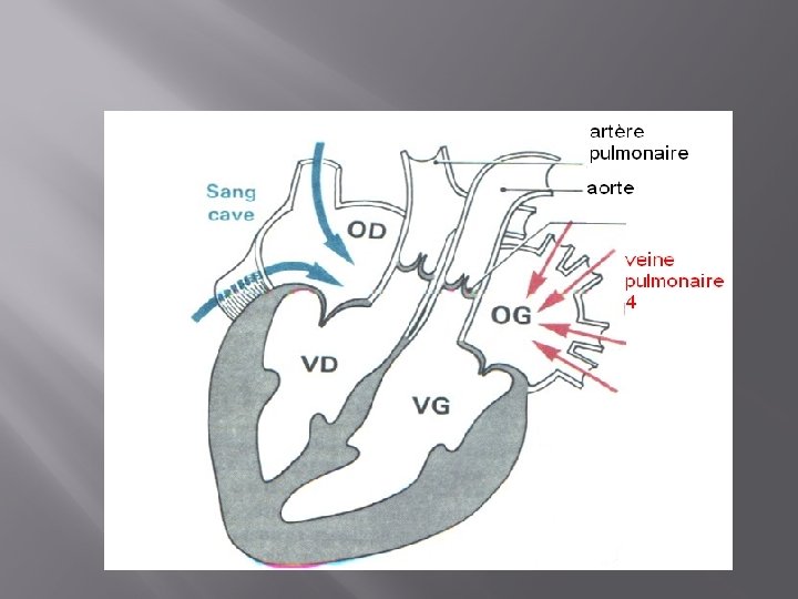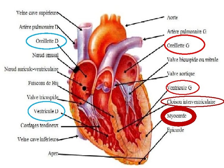 -Le cœur droit est formé de : VD – OD qui communiquent entres eux par l’orifice tricuspide -le cœur gauche est formé de : VG – OG qui communiquent entres eux par l’orifice mitral -les 2 oreillettes sont séparés / septum interauriculaire -les 2 ventricules sont séparés / septum interventriculaire