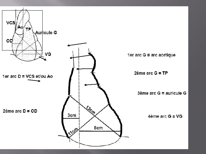 1 er arc droit : veine cave supérieur et/ou aorte 2ème arc droit : oreillette droit 1 er arc G: arc aortique 2ème arc gauche: TP 3ème arc G : OG 4ème arc G : VG