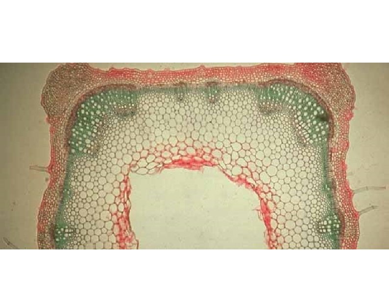 épiderme Hypoderme (une assise de cellules) Massif de collenchyme aux angles de la tige à section carrée Pôles du protoxylème Xylème secondaire = bois Phloème secondaire (liber) Phloème primaire Formations secondaires réduites entre les faisceaux cribro-vasculaires Grosse cellule sécrétrice (essence) Base du poil sécréteur épiderme collenchyme