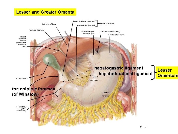 • Cardiac region (cardia) muscularis externa (longitudinal, circular, oblique muscles) • Body • Pyloric region (pyloric antrum, pyloric canal, pylorus, pyloric sphincter valve) • Lesser momentum (liver to lesser curvature) • Greater momentum (greater curvature to cover small intestine)
