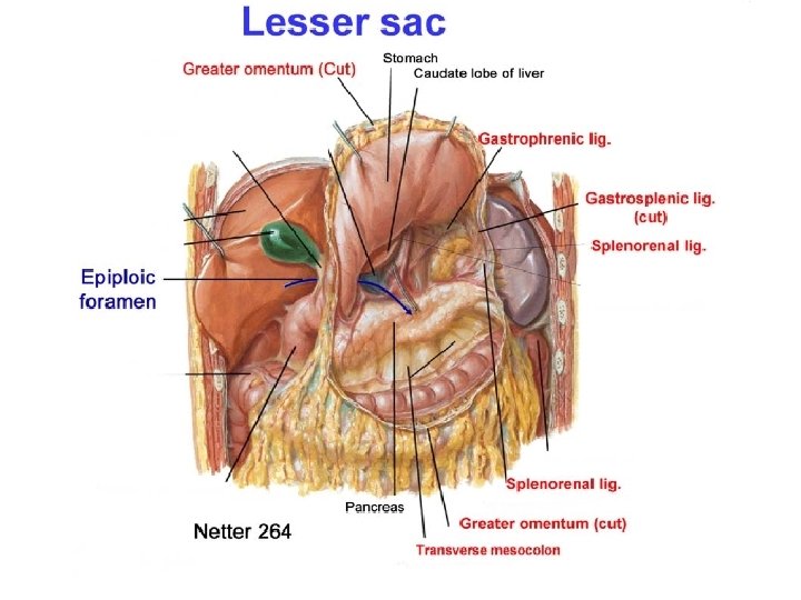 First part of duodenum • It begins at the pylorus and runs upward and backward on the transpyloric plane at the level of the 1 st lumbar vertebra • The relations of this part are as follows: • ■■ Anteriorly: The quadrate lobe of the liver and the gallbladder • ■■ Posteriorly: The lesser sac (first inch only), the gastroduodenal artery, the bile duct and the portal vein, and the inferior vena cava • ■■ Superiorly: The entrance into the lesser sac (the epiploic foramen) • ■■ Inferiorly: The head of the pancreas