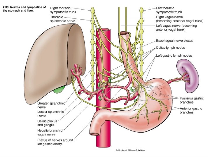 Sphincters of the Stomach • The inferior Esophageal sphincter is a (physiological) located between the oesophagus and the stomach. • It is located to the left of the T 11 vertebra. Situated immediately superior is the Esophageal hiatus. • Histologically, the sphincter is marked by an abrupt change from stratified squamous epithelium to simple columnar. • At the Esophageal hiatus, the right crus of the diaphragm exerts pressure on the Esophageal wall. • In the normal (non-eating) state, the lumen of the Esophagus is collapsed. • The Esophagus enters the stomach at an angle – when the stomach is full, this closes off entry to the stomach.
