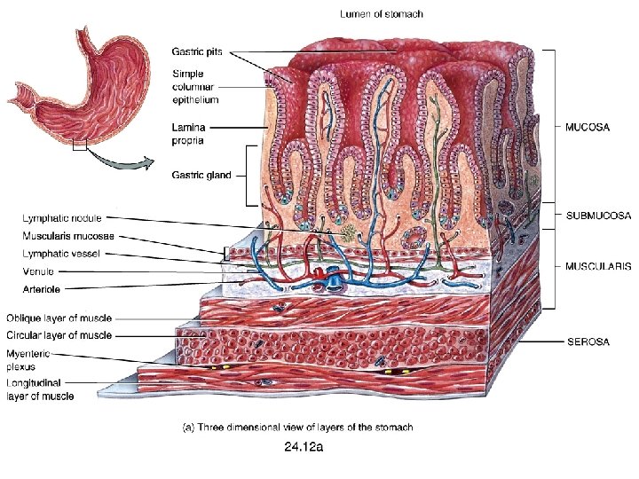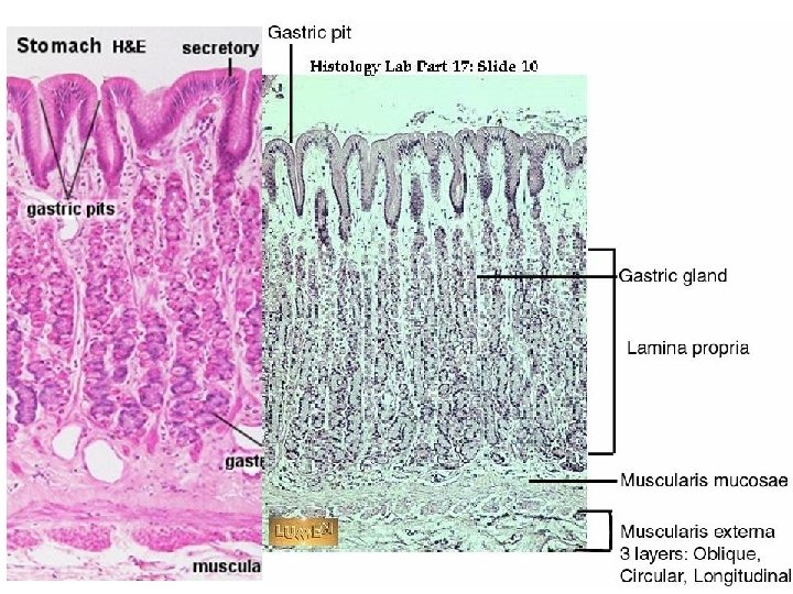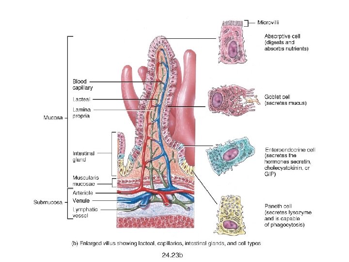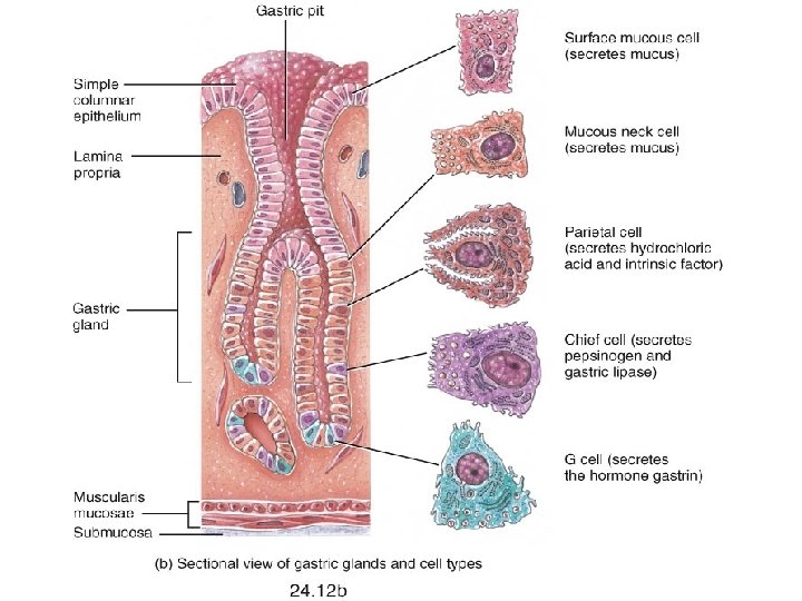 Microscopic Anatomy • Enteroendocrine cells found in the gastric glands secrete various hormones into the interstitial fluid of the lamina propria. These include gastrin, which is released mainly by enteroendocrine G • Intrinsic factor is required for absorption of B 12 in the small intestine