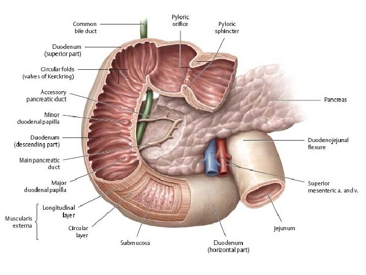 Relation of the second part of duodemum • ■■ Anteriorly: The fundus of the gallbladder and the right lobe of the liver, the transverse colon, and the coils of the small intestine • ■■ Posteriorly: The hilum of the right kidney and the right ureter • ■■ Laterally: The ascending colon, the right colic flexure, and the right lobe of the liver • ■■ Medially: The head of the pancreas, the bile duct, and the main pancreatic duct