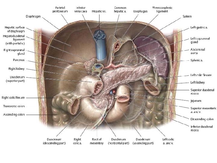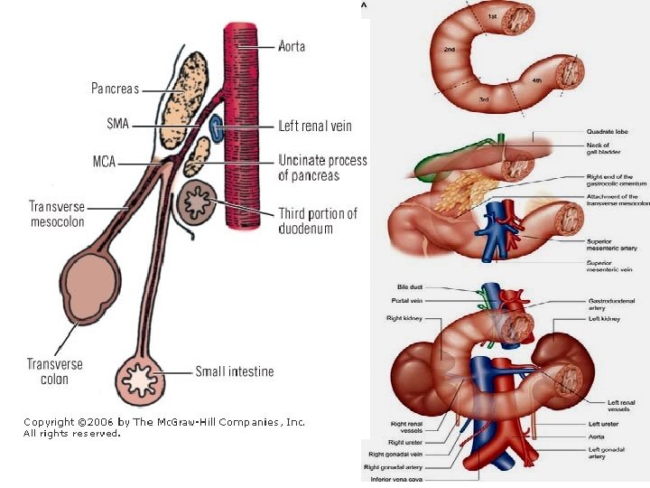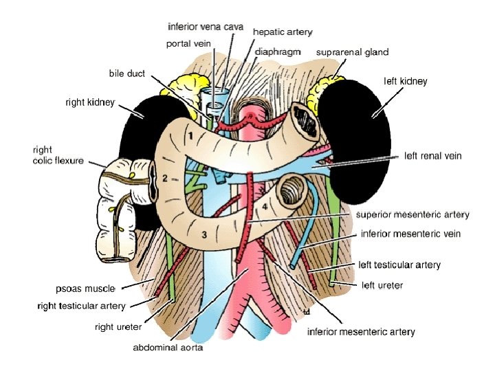 • The third part of the duodenum • it runs horizontally to the left on the subcostal plane, passing in front of the vertebral column and following the lower margin of the head of the pancreas • Relations of this part are : • ■■ Anteriorly: The root of the mesentery of the small intestine, the superior mesenteric vessels contained within it, and coils of jejunum • ■■ Posteriorly: The right ureter, the right psoas muscle, the inferior vena cava, and the aorta • ■■ Superiorly: The head of the pancreas • ■■ Inferiorly: Coils of jejunum Fourth Part of the Duodenum
