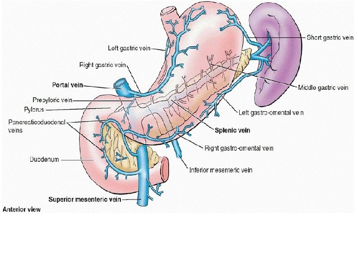 VENOUS DRAINAGE • Right & Left gastric veins-Portal vein • Right gastroepiploic vein-superior mesenteric vein • Left gastroepiploic & Short gastric veins-Splenic vein