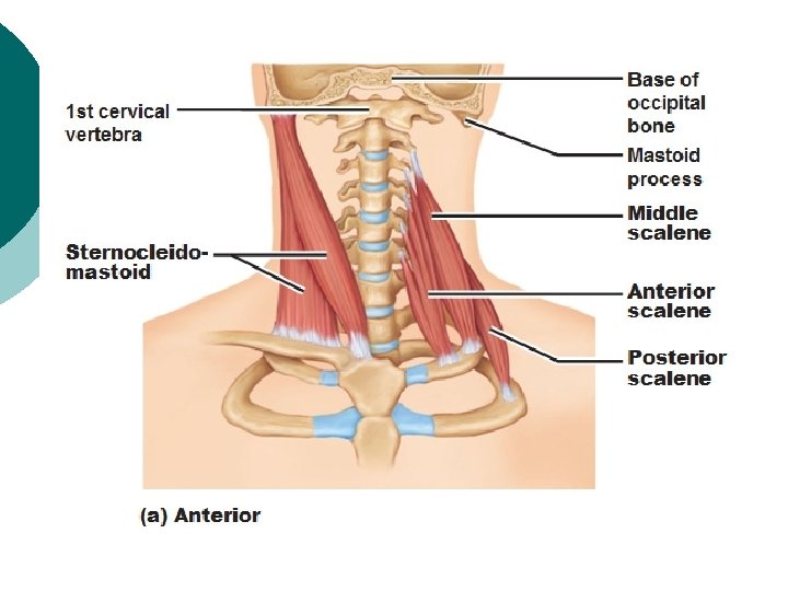 Muscles ¡ Trapezius l ¡ Sternocleidomastoid l ¡ Lateral flexion, rotation Scalenes l ¡ Upper portion aids in cervical extension Flexion of cervical area Multifidis l Rotation of spine