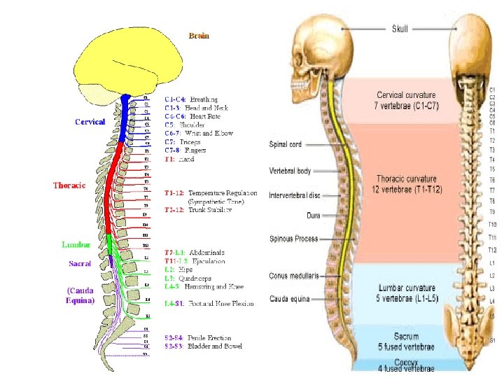 Spinal Cord Part of the CNS along with brain ¡ Contained within vertebral canal ¡ Extends from cranium to 1 st-2 nd lumbar vertebrae ¡ Lumbar roots & sacral nerves for a “horse-like tail” called cauda equina ¡ 2 plexuses ¡ l Brachial, lumbosacral