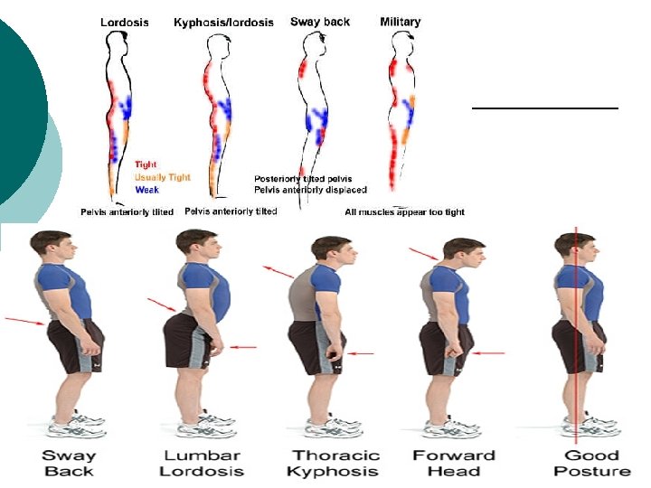 Posture ¡ Problems l l Forward head position-ears in front of line with shoulder Kyphosis-excessive curve of thoracic spine Lordosis-excessive curve of lumbar spine Scoliosis-lateral curve of spine