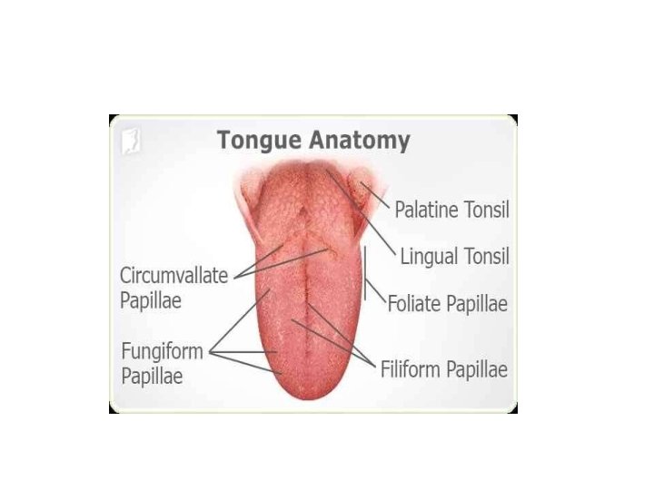 • The tongue's upper surface (dorsum) is covered by taste buds housed in numerous lingual papillae. • The human tongue is divided into two parts, an oral part at the front and a pharyngeal part at the back. BLOOD SUPPLY • lingual artery • external carotid artery VENOUS DRAINAGE • lingual veins • internal jugular vein NERVE SUPPLY • hypoglossal nerve • Taste and sensation: glossopharyngeal nerve
