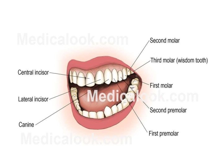 PERMANENT TEETH • Among permanent teeth, 16 are found in the maxilla and 16 in the mandible, for a total of 32. The dental formula is 2. 1. 2. 3/2. 1. 2. 3. • Age 21, all 32 of the permanent teeth have usually erupted. The permanent teeth are the: • Two incisor (for cutting)-central incisor, lateral incisor • One canine (for tearing) • Two premolar(for crushing)-first premolar, second premolar, • Three molar (for grinding)-first molar, second molar, and third molar.