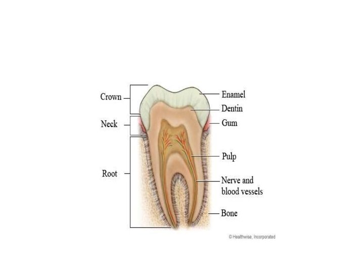 • Dentin is a mineralized connective tissue with an organic matrix of collagenous proteins. CEMENTUM • Cementum is a specialized bone like substance covering the root of a tooth. • Its coloration is yellowish and it is softer than dentin and enamel. DENTAL PULP • The dental pulp is the central part of the tooth filled with soft connective tissue. • This tissue contains blood vessels and nerves that enter the tooth from a hole at the apex of the root.