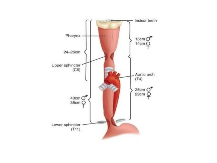 • • THE ESOPHAGUS Theesophagus oroesophagus, commonly known as the food pipe or gullet, The esophagus is a muscular tube connecting the throat (pharynx) with the stomach. The esophagus runs behind the windpipe (trachea) and heart, and in front of the spine. Length : 25 cm Diameter: 2 cm