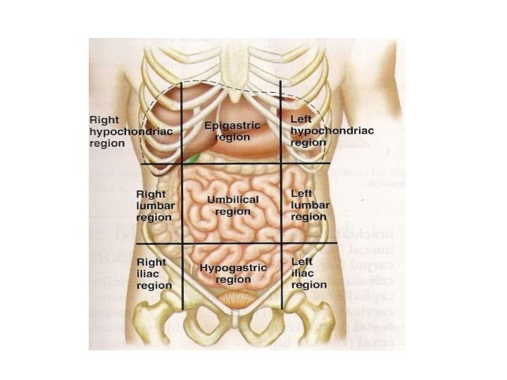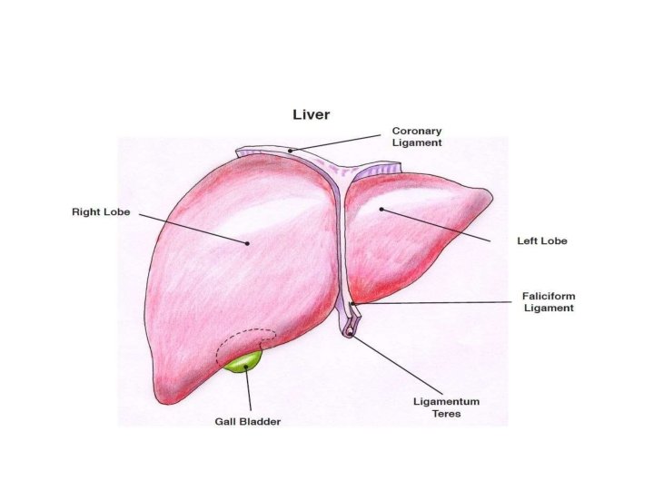 • The liver is grossly divided into two parts when viewed from above – a right and a left lobe. • The falciform ligament, divides the liver into a left and right lobe. FUNCTIONS • Synthesis • Proteins produced and secreted by the liver. • The liver plays a major role in carbohydrate, protein, amino acid, and lipid metabolism. Breakdown • The liver is responsible for the breakdown of insulin and other hormones.