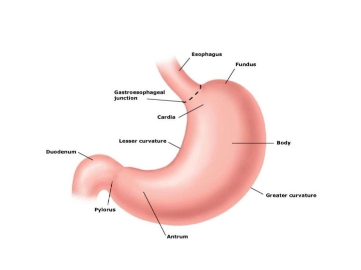 • A pouch-like organ primarily designed for food storage (for 2 -4 hours) , some mechanical and chemical digestion also occur. • Contains two sphincters at both ends to regulate food movement : • cardiac sphincter near the esophagus , • pyloric sphincter near the small intestine. Divided into 4 regions : • cardiac stomach (or cardiac), • fundic stomach (or funded) , • body of stomach • pyloric stomach (or Pylorus).
