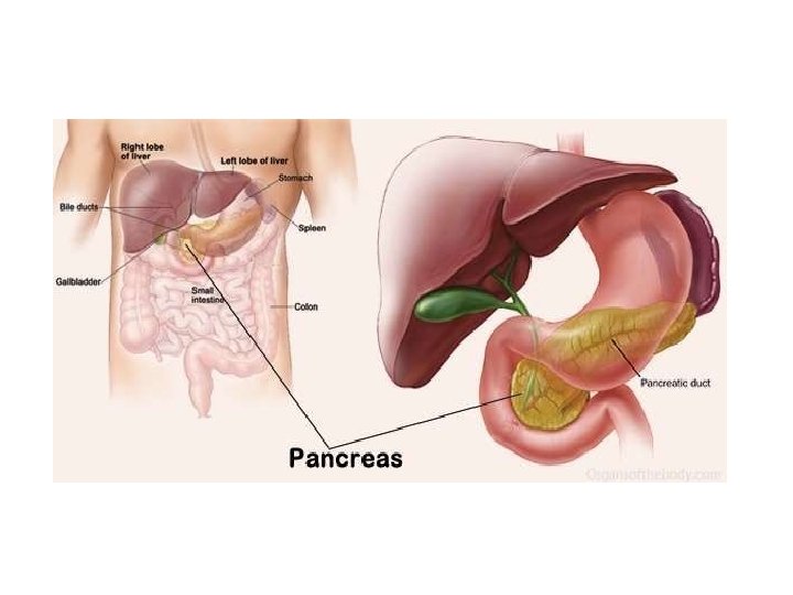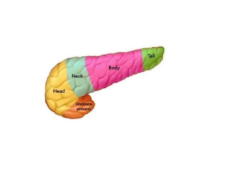 Structure • Anatomically, the pancreas is divided into the head of pancreas, • the neck of pancreas, • the body of pancreas, • and the tail of pancreas. • The neck is about 2. 5 cm or 1 inch long and lies between the head and the body • The body is the largest part of the pancreas and lies behind the pylorus. • The tail ends by abutting the spleen.