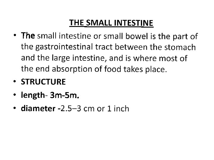 • The stomach secretes acid and powerful enzymes that continue the process of breaking down the food. • When it leaves the stomach, food is the consistency of a liquid or paste. • From there the food moves to the small intestine. • The small intestine continues the process of breaking down food by using enzymes released by the pancreas and bile from the liver. • Bile is a compound that aids in the digestion of fat and eliminates waste products from the blood.