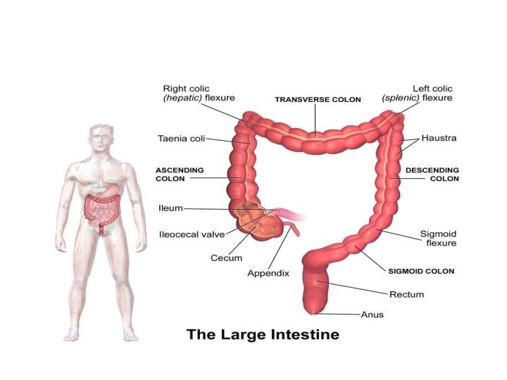 THE LARGE INTESTINE • The large intestine, also known as the large bowel or colon, is the last part of the gastrointestinal tract and of the digestive system in vertebrates. • Water is absorbed here and the remaining waste material is stored as feces before being removed by defecation.