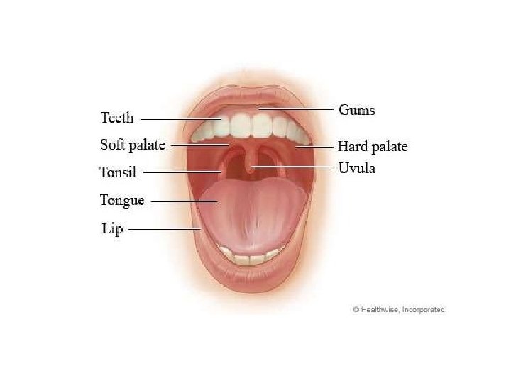 MOUTH The mouth is the first portion of the alimentary canal that receives food and produces saliva. The oral mucosa is the mucous membrane epithelium lining the inside of the mouth. Relations: • Anteriorly-lips • Posteriorly-continue with the oropharynx • Laterally-muscles of cheeks • Superiorly-bony hard palate • Inferiorly-muscular tongue & the soft tissues of the floor of the mouth •