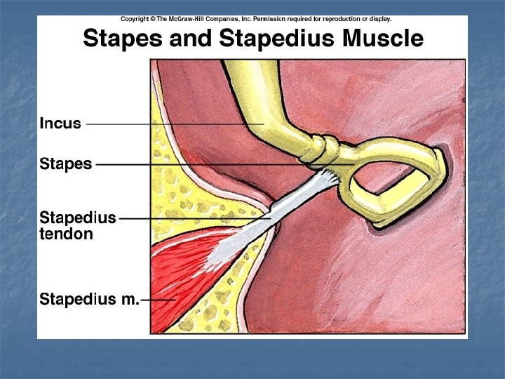 Acoustic Reflex n The movement of the ossicles may be stiffened by two muscles, the stapedius and tensor tympani, which are under the control of the facial nerve and trigeminal nerve, respectively. These muscles contract in response to loud sounds, thereby reducing the transmission of sound to the inner ear. This is called the acoustic reflex