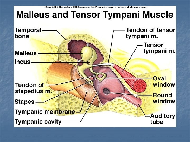 The Middle Ear: n n n A cleft within the temporal bone Lining is mucous membrane Tympanic Membrane separates it from EAC Eustachian tube connects it to nasopharynx Also Connected to Mastoid Air Cells