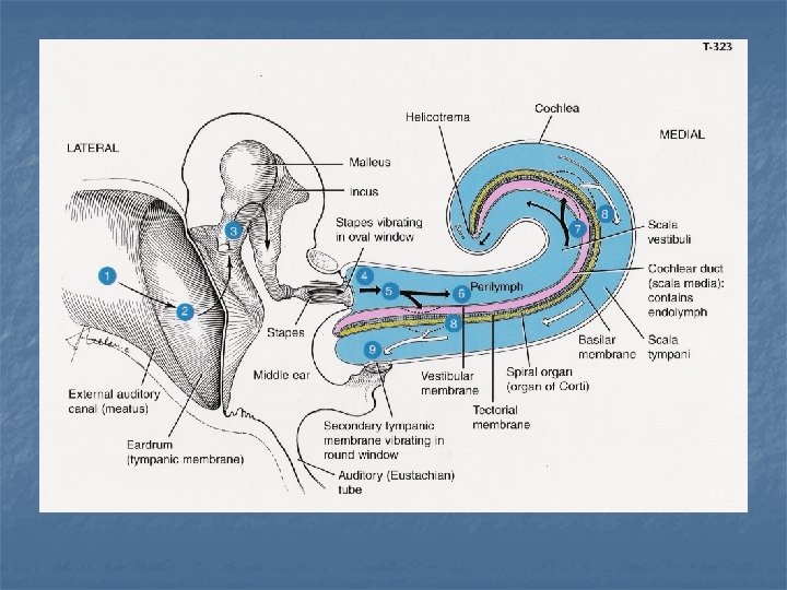 Function of Middle Ear n Conduction n n Protection n Creates a barrier that protects the middle and inner areas from foreign objects Middle ear muscles may provide protection from loud sounds Transducer n n n Conduct sound from the outer ear to the inner ear Converts acoustic energy to mechanical energy Converts mechanical energy to hydraulic energy Amplifier n n Transformer action of the middle ear only about 1/1000 of the acoustic energy in air would be transmitted to the inner-ear fluids (about 30 d. B hearing loss)