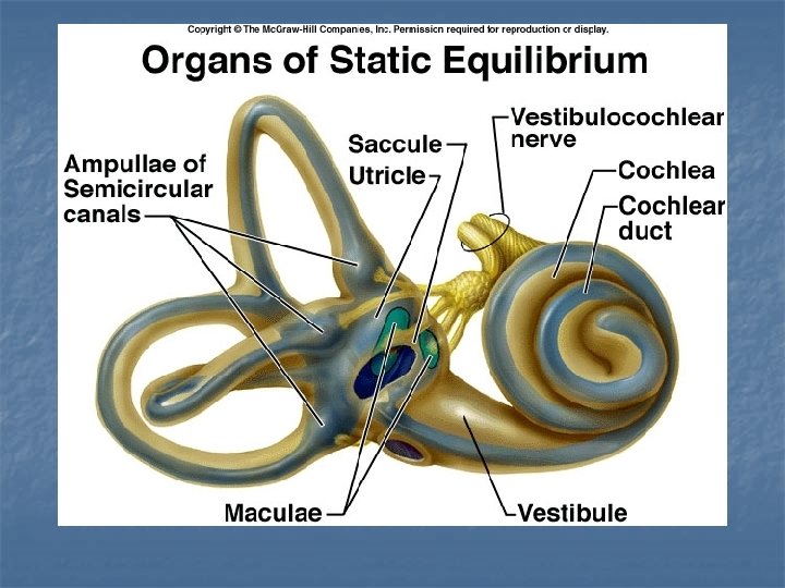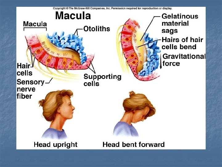 Static Equilibrium Inside the vestibule are two chambers : utricle and saccule. Regions of hair cells and supporting cells called maculae. Otoliths – “ear rocks”