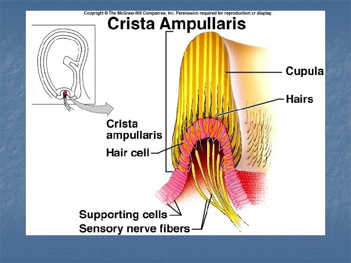 Dynamic Equilibrium Semicircular canals In ampulla is the crista ampullaris – contains hair cells and supporting cells covered by a gelatinous mass called the cupula. Neurological connections between eyes and semicircular canals – for tracking Nystagmus