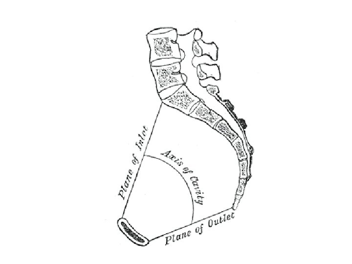 • The outlet is formed by the pubic arch, ischial spines, sacrotuberous ligaments and the coccyx. • The enclosed space between the inlet and outlet is called the true pelvis, with the plane of the inlet being at right angles to the plane of the outlet.