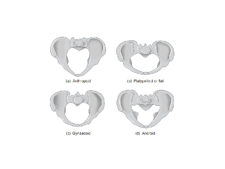 Types of Pelvis • • Gynaecoid Anthropoid Android Platypelloid (Flat)