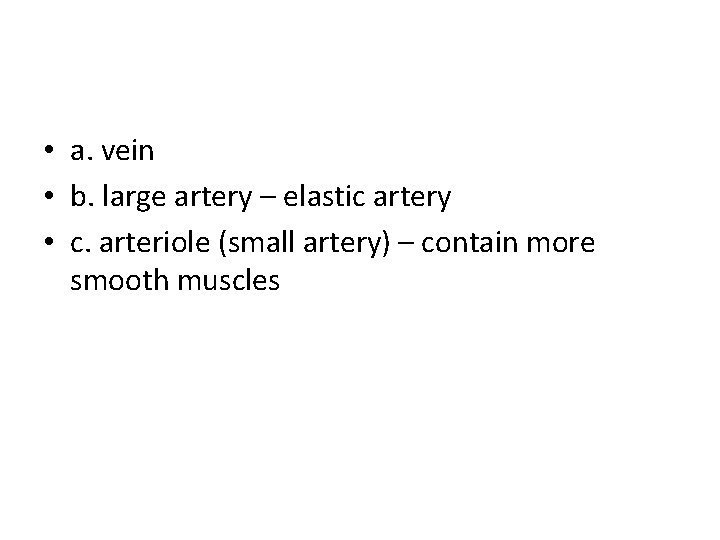 • a. vein • b. large artery – elastic artery • c. arteriole (small artery) – contain more smooth muscles