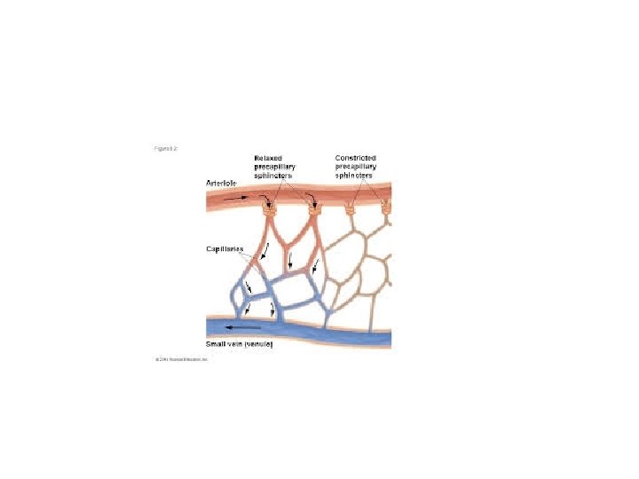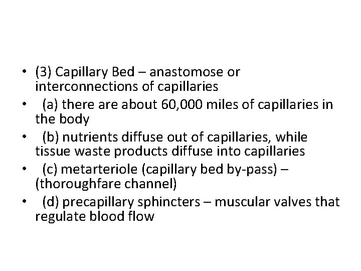 • (3) Capillary Bed – anastomose or interconnections of capillaries • (a) there about 60, 000 miles of capillaries in the body • (b) nutrients diffuse out of capillaries, while tissue waste products diffuse into capillaries • (c) metarteriole (capillary bed by-pass) – (thoroughfare channel) • (d) precapillary sphincters – muscular valves that regulate blood flow