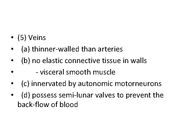 • • • (5) Veins (a) thinner-walled than arteries (b) no elastic connective tissue in walls - visceral smooth muscle (c) innervated by autonomic motorneurons (d) possess semi-lunar valves to prevent the back-flow of blood