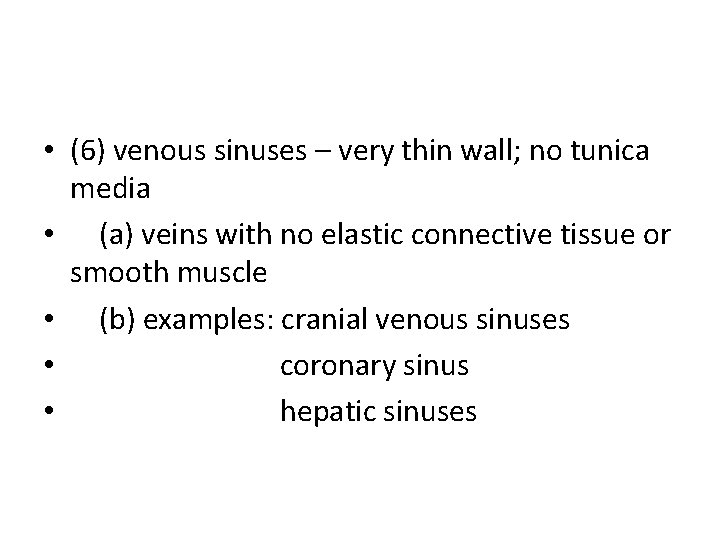 • (6) venous sinuses – very thin wall; no tunica media • (a) veins with no elastic connective tissue or smooth muscle • (b) examples: cranial venous sinuses • coronary sinus • hepatic sinuses