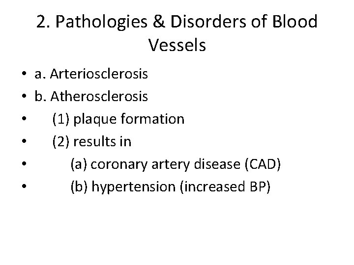 2. Pathologies & Disorders of Blood Vessels • a. Arteriosclerosis • b. Atherosclerosis • (1) plaque formation • (2) results in • (a) coronary artery disease (CAD) • (b) hypertension (increased BP)