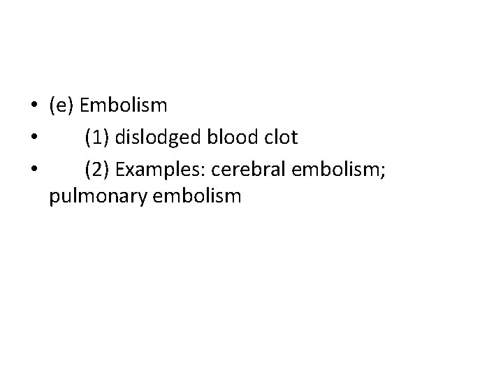 • (e) Embolism • (1) dislodged blood clot • (2) Examples: cerebral embolism; pulmonary embolism