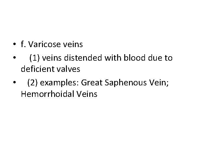 • f. Varicose veins • (1) veins distended with blood due to deficient valves • (2) examples: Great Saphenous Vein; Hemorrhoidal Veins