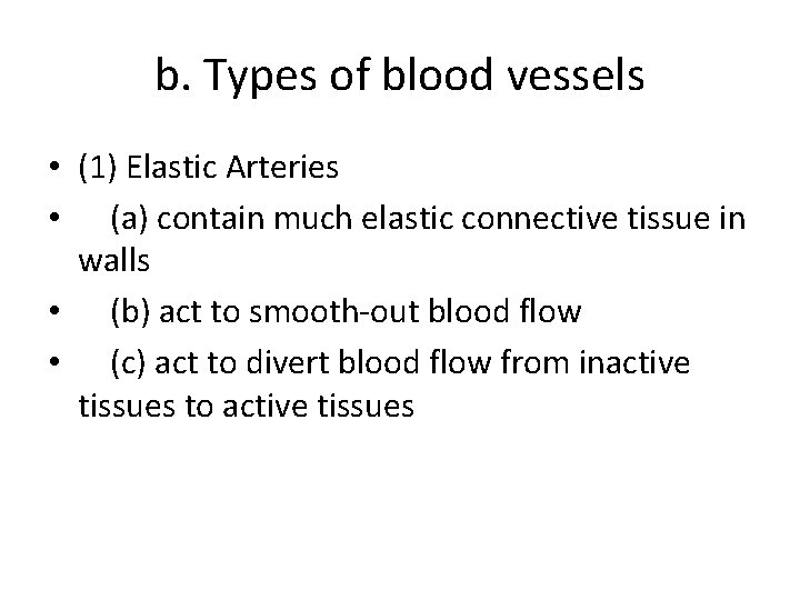 b. Types of blood vessels • (1) Elastic Arteries • (a) contain much elastic connective tissue in walls • (b) act to smooth-out blood flow • (c) act to divert blood flow from inactive tissues to active tissues