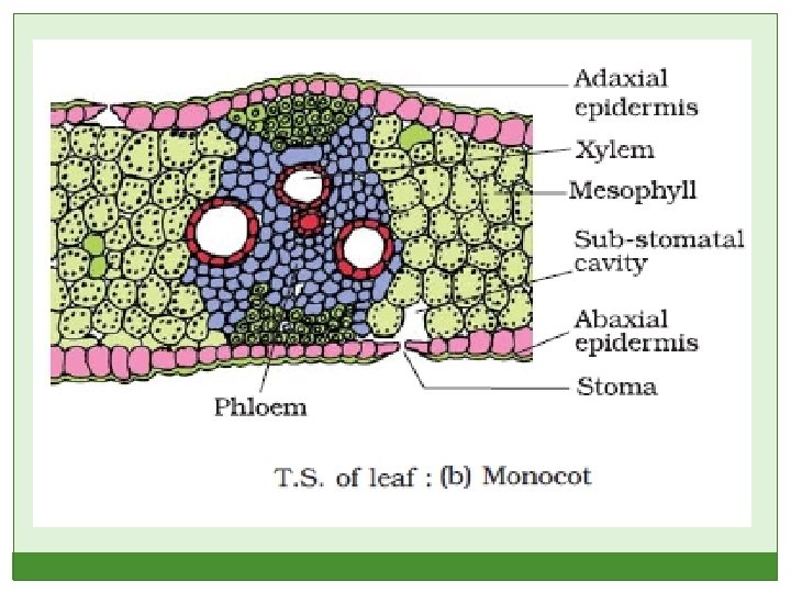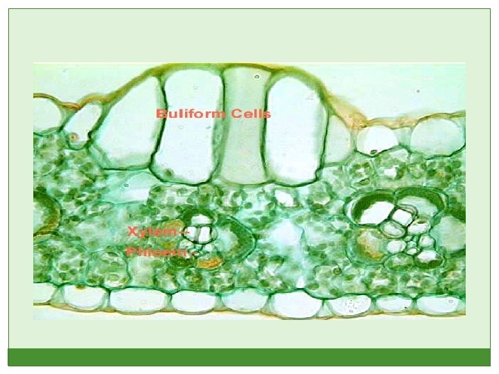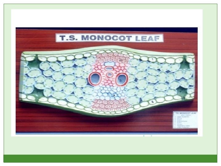 ANATOMY OF MONOCOTYLEDONOUS/ ISOBILATERAL LEAF � The upper and lower surfaces are covered by single –layered epidermis. � The upper or adaxial epidermis has some cells larger than the others; such large cells are called bulliform cells. They play an important role in the rolling of leaves. � Stomata found on both adaxial and abaxial epidermal layers.
